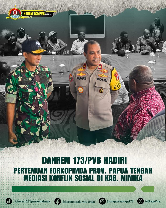 Papua Tengah —Komitmen TNI bersama pemerintah daerah dalam menjaga stabilitas keamanan dan keharmonisan sosial di wilayah Papua Tengah kembali ditunjukkan melalui kehadiran Komandan Korem 173/PVB Brigjen TNI I Ketut Mertha Gunarda dalam kegiatan penyelesaian konflik sosial antara kubu Newegala dan kubu Dang yang sebelumnya mengakibatkan terjadinya perang suku yang berkelanjutan.