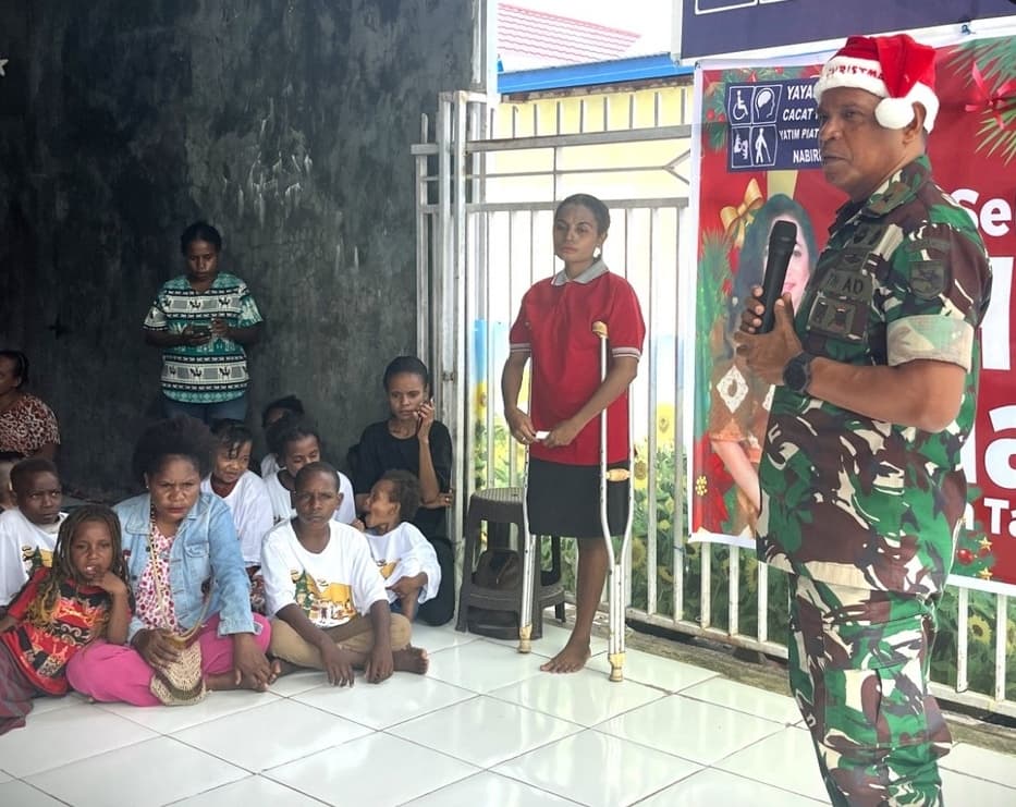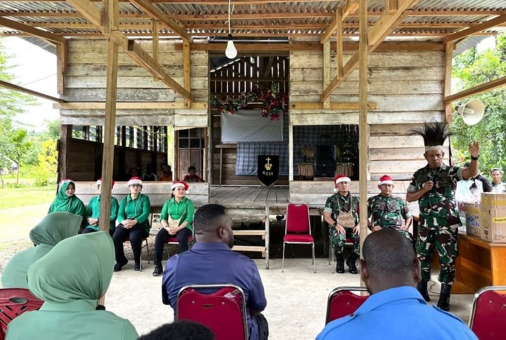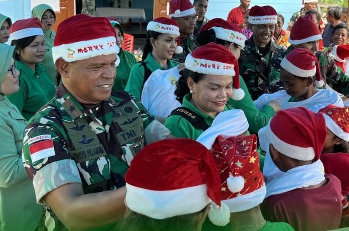 Nabire Papua Tengah, Dalam semangat Natal dan sebagai wujud kepedulian terhadap sesama, Danrem 173/PVB, Brigjen TNI Frits W.R. Pelamonia di dampingi oleh Ketua Persit KCK Koorcab Rem 173, Ny. Jeni Frits W.R Pelamonia, melaksanakan kegiatan sosial dengan memberikan bantuan kepada panti asuhan dan gereja-gereja di wilayah kabupaten Nabire. Senin (23/12/2024).