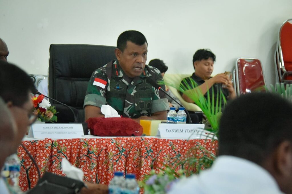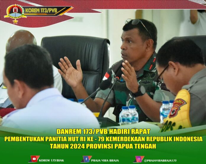 Nabire, Komandan Korem 173/PVB,Brigjen TNI Frits W.R. Pelamonia, menghadiri rapat penting dalam rangka pembentukan panitia untuk perayaan Hari Ulang Tahun (HUT) ke 79 Kemerdekaan Republik Indonesia Tahun 2024 di Prov Papua Tengah, bertempat di Aula Kantor Gubernur Papua Tengah Jl. Merdeka, Kel. Karang Mulia, Distrik Nabire, Kab. Nabire, Prov. Papua Tengah, Rabu (26/6/2024).