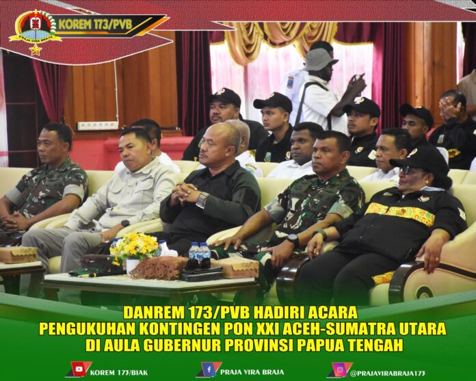 Nabire, Komandan Resor Militer 173/PVB, Brigjen TNI Frits W.R. Pelamonia, menghadiri acara pengukuhan kontingen Pekan Olahraga Nasional XXI Aceh-Sumatra Utara bertempat di Aula Gubernur Jl. Merdeka, Kel. Karang Mulia, Distrik Nabire, Kab. Nabire, Prov. Papua Tengah, Rabu (31 Juli 2024).