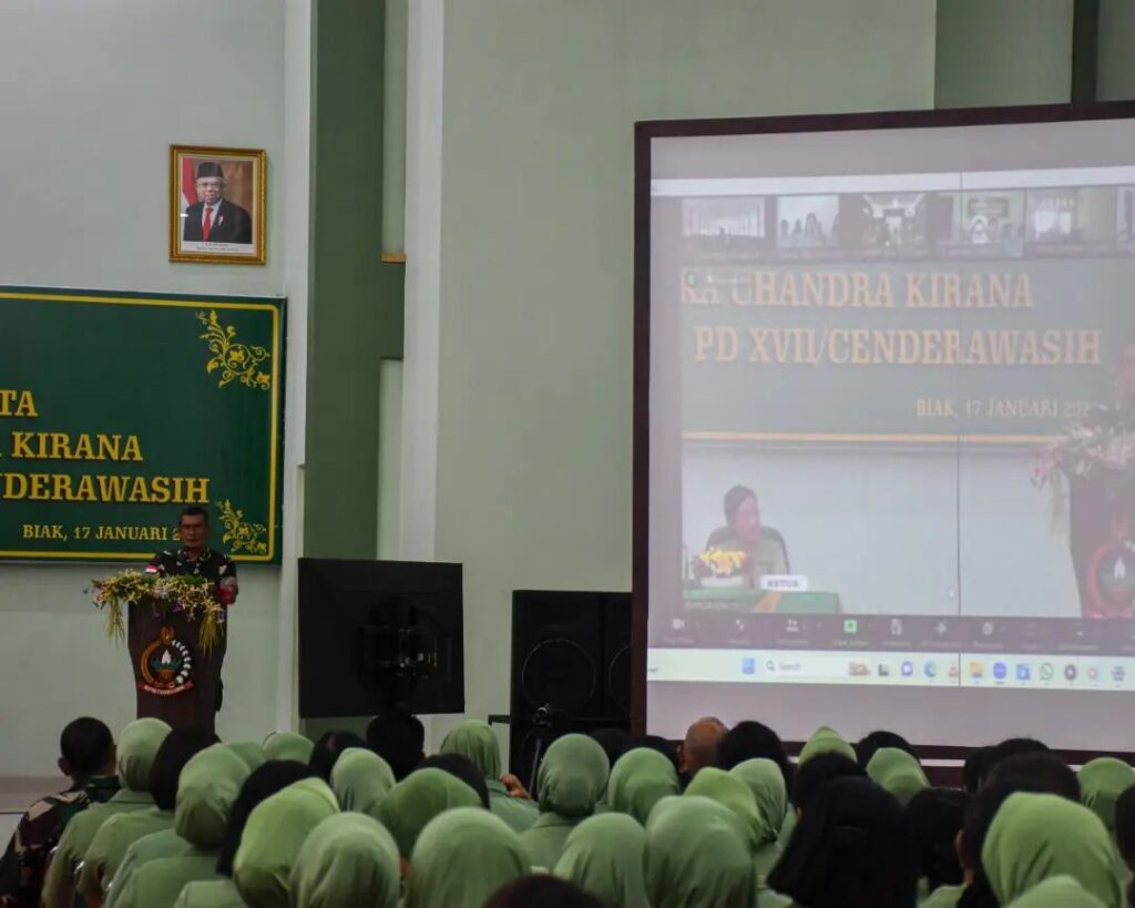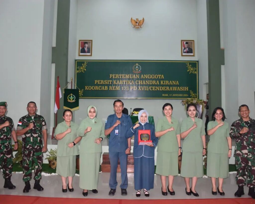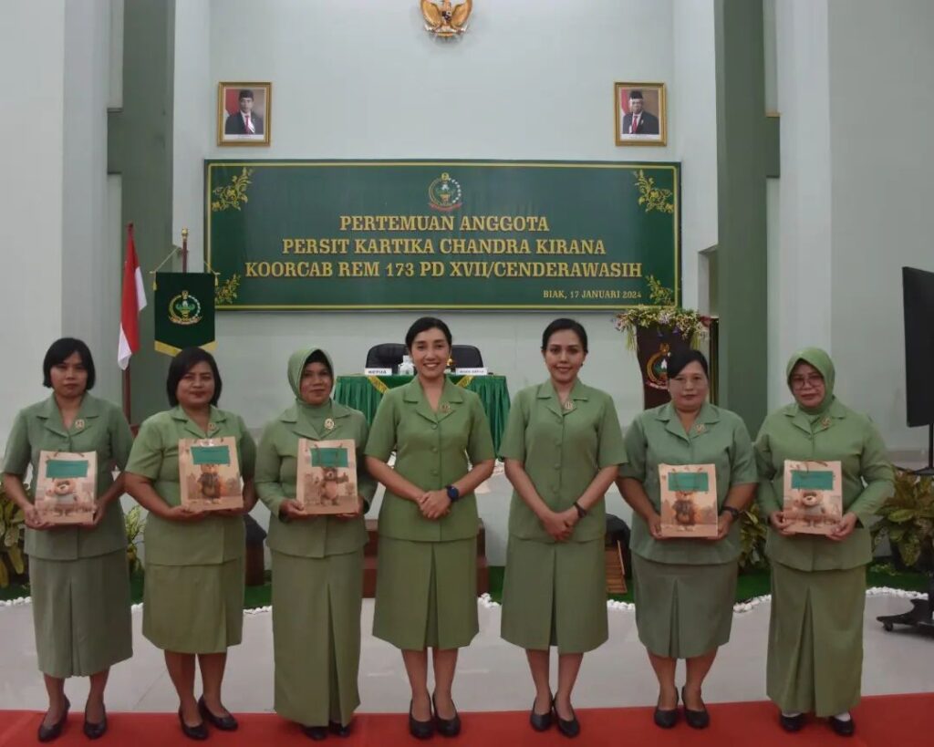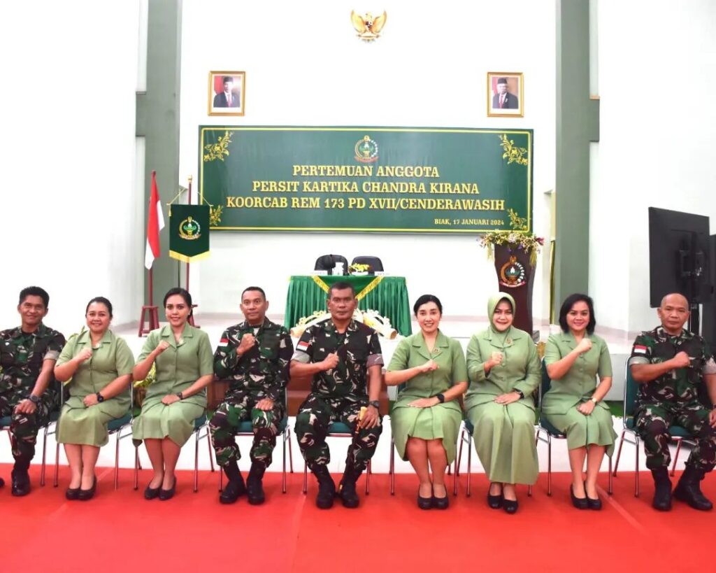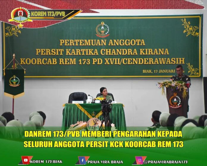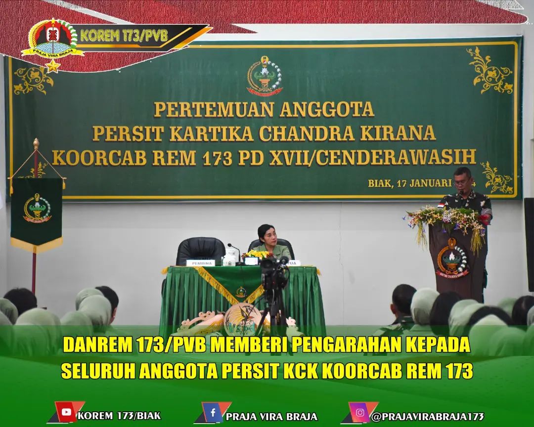 Biak, Komandan Korem 173/PVB Brigjen TNI Franz Yohannes Purba, S.I.P., M.M. selaku Pembina Persit Kartika Chandra Kirana Koorcab Rem 173, didampingi Ketua Persit KCK Koorcab Rem 173, Ny. Eva F Y Purba, memberikan pengarahan kepada seluruh anggota Persit KCK sejajaran Koorcab Rem 173 PD XVII/Cenderawasih, baik yang berada di Aula Graha Makorem 173/PVB Biak, maupun yang berada di Cabang-cabang di luar Biak melalui sambungan video conference, Rabu (17/01/2024)