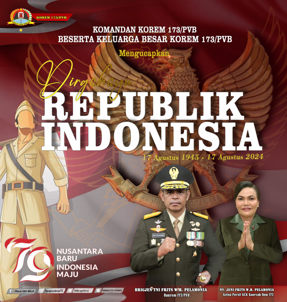 BerandaBerita unggulanDIRGAHAYU NEGARA KESATUAN REPUBLIK INDONESIA YANG KE - 79 TAHUN " NUSANTARA... Berita unggulanKegiatan Jajarankorem 173 DIRGAHAYU NEGARA KESATUAN REPUBLIK INDONESIA YANG KE – 79 TAHUN ” NUSANTARA BARU, INDONESIA MAJU” By admin Agustus 17, 2024 0 3320 Bagikan FacebookTwitterWhatsApp Tags#PUSPENTNIDISPENADHUTRIHUTRI2024HUTRI79HUTRIKE79TAHUNkodam cenderawasihkodam17korem 173MABESTNI Bagikan FacebookTwitterWhatsApp Artikel SebelumnyaDANREM 173/PVB HADIRI ACARA PENGUKUHAN PASUKAN PENGIBAR BENDERA PUSAKA TINGKAT PROVINSI PAPUA TENGAH TAHUN 2024Artikel SelanjutnyaPeringati HUT TNI ke-79, Korem 173/PVB Gelar Kegiatan Donor Darah, Pengobatan Umum dan Pembagian Sembako serta makan gratis adminhttps://korem173.tni-ad.mil.id RELATED ARTICLES Berita unggulan Pimpin Upacara 17-an di Makorem 173/PVB, Brigjen TNI I Ketut Mertha Gunarda Tekankan Disiplin, Akuntabilitas Program Kerja dan Peran Prajurit Bangun Papua Maret 17, 2026 Berita unggulan Kolonel Inf Budy Suradi Hadiri Rapat Kesiapan Pengamanan Idul Fitri 1447 H di Nabire, Perkuat Sinergi Lintas Sektoral Maret 12, 2026 Berita unggulan Kasi Intel Kasrem 173/PVB Kolonel Inf Budy Suradi Hadiri Rapat Pimpinan Polda Papua Tengah 2026, Perkuat Sinergitas TNI–Polri Demi Stabilitas Keamanan dan Dukungan Program... Maret 12, 2026 TINGGALKAN KOMENTAR Batal membalas Komentar: Silakan masukkan komentar anda! Nama:* Silakan masukkan nama Anda di sini Email:* Anda telah memasukkan alamat email yang salah! Silakan masukkan alamat email Anda di sini Website: Simpan nama, email, dan situs web saya di browser ini untuk lain kali saya berkomentar. Δ Berita Populer Pimpin Upacara 17-an di Makorem 173/PVB, Brigjen TNI I Ketut Mertha Gunarda Tekankan Disiplin, Akuntabilitas Program Kerja dan Peran Prajurit Bangun Papua Maret 17, 2026 Kolonel Inf Budy Suradi Hadiri Rapat Kesiapan Pengamanan Idul Fitri 1447 H di Nabire, Perkuat Sinergi Lintas Sektoral Maret 12, 2026 Kasi Intel Kasrem 173/PVB Kolonel Inf Budy Suradi Hadiri Rapat Pimpinan Polda Papua Tengah 2026, Perkuat Sinergitas TNI–Polri Demi Stabilitas Keamanan dan Dukungan Program... Maret 12, 2026 DIRGAHAYU KOSTRAD KE 65 TAHUN Maret 6, 2026 Muat lebih banyak Komentar Terbaru budi pada KOMITMEN JAGA NETRALITAS TNI, DANREM 173/PVB SOSIALISASIKAN NETRALITAS TNI DI WILAYAH KAB. SUPIORI.
