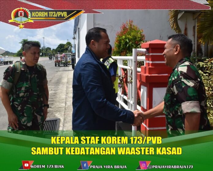 Biak, Kepala Staf Korem 173/PVB, Kolonel Inf Feksy Dimunry Angi, S.E., mewakili Danrem 173/PVB, Brigjen TNI Frits Wilem Rizard Pelamonia, S.E., menyambut kedatangan Waaster Kasad, Brigjen TNI Taufiq Shobri, ke markas Korem 173/PVB. Kedatangan Waaster Kasad menjadi momentum penting dalam pelaksanaan kegiatan pengawasan dan evaluasi terhadap kinerja Staf Teritorial, khususnya dalam bidang komunikasi sosial (komsos), Pada semester 1 tahun 2024 di Korem 173/PVB. ( 23-04-2024 ).