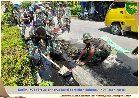 Biak ~ Sebagai wujud kepedulian terhadap lingkungan, Kodim 1708/BN dipimpin langsung oleh Kasdim 1708/BN Mayor Kav M. Eka Perwira Candra, S.H., M.I.P, menggelar Karya Bakti pembersihan saluran air di Pasar Inpres, Distrik Biak Kota, Kabupaten Biak Numfor, Papua, Jumat (8/12/2023).
