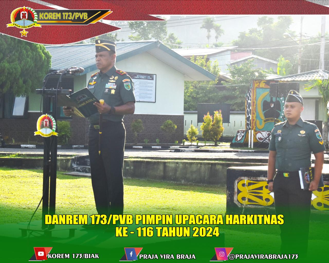 Biak, Komando Resor Militer 173/Praja Vira Braja melaksanakan Upacara memperingati Hari Kebangkitan Nasional (Harkitnas) yang ke-116 tahun 2024 bertempat di lapangan Upacara Kompi Senapan-C Yonif 753/AVT, Jl Yan Mamoribo Kelurahan Brambaken Distrik Samofa Prov Biak Numfor, Senin 20 Mei 2024.