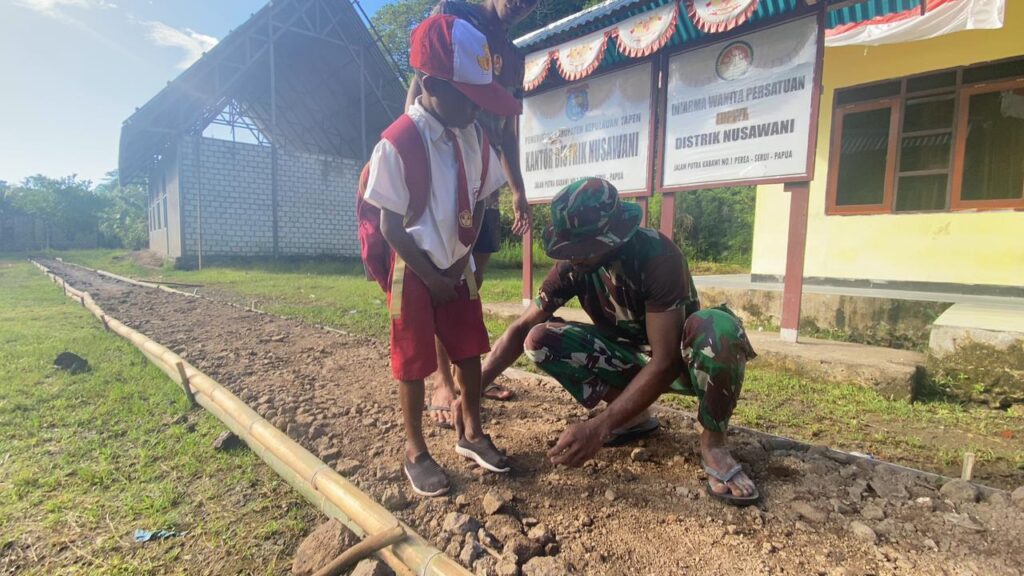Yapen, Sebagai wujud kepedulian Satgas TMMD ke-121 Kodim 1709/Yawa dalam meningkatkan semangat dan kerajinan anak-anak Kampung Perea untuk pergi menuntut ilmu disekolah, Personel Satgas TMMD menjemput dikediamannya masing-masing dan mengantar anak-anak hingga menuju ruangan kelas SD Negeri Kampung Perea, Distrik Nusawani, Kabupaten Kepulauan Yapen, Senin (29/07/2024).