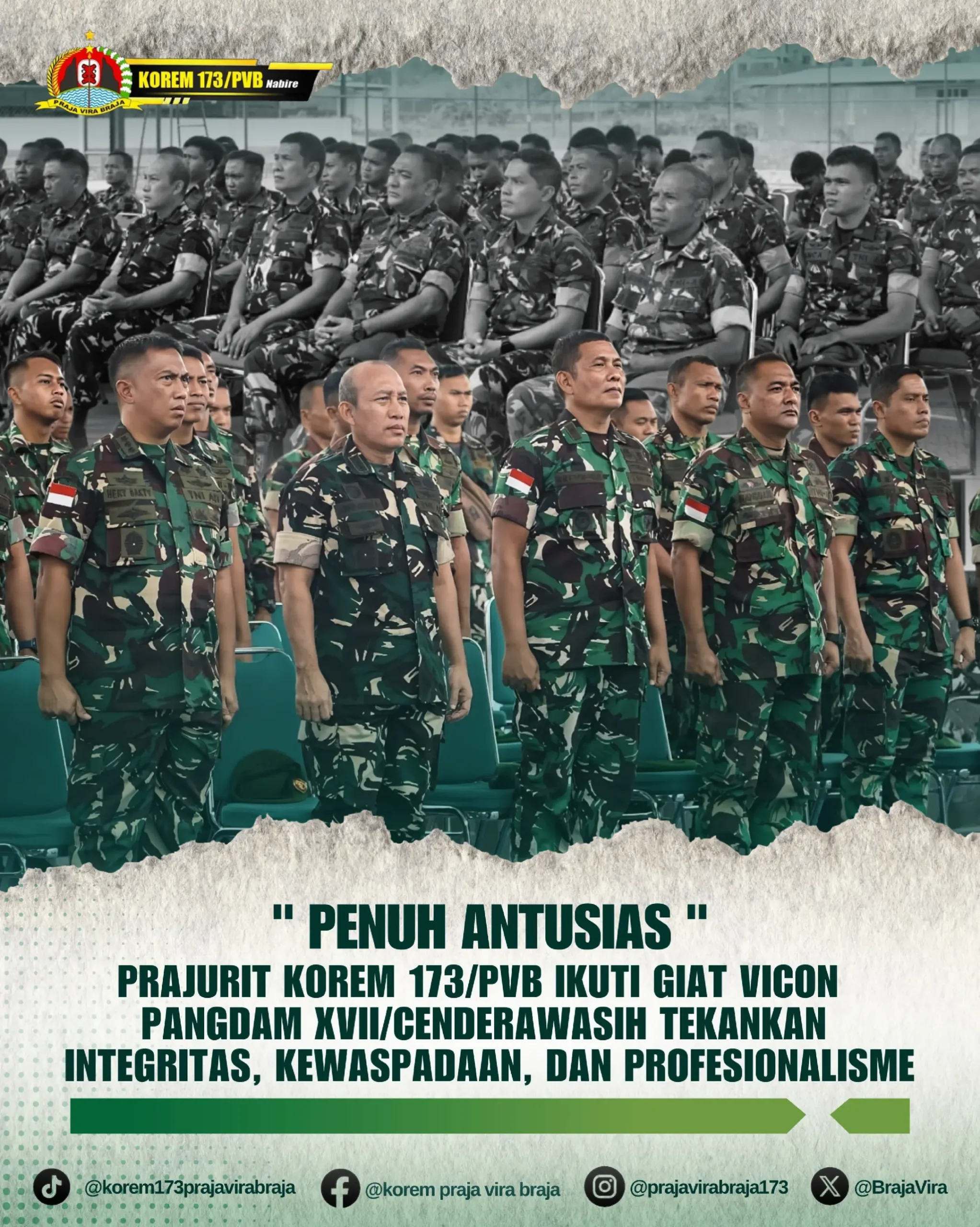 Mengakhiri pengarahan, Pangdam mengajak seluruh prajurit untuk menjaga kehormatan satuan, memperkuat soliditas internal, serta terus meningkatkan profesionalisme dalam setiap pelaksanaan tugas.Dengan semangat pengabdian dan loyalitas tinggi, Korem 173/PVB di Nabire selalu berkomitmen untuk senantiasa hadir sebagai garda terdepan dalam menjaga stabilitas keamanan dan mendukung seluruh program pembangunan di wilayah Papua Tengah dan sekitarnya.