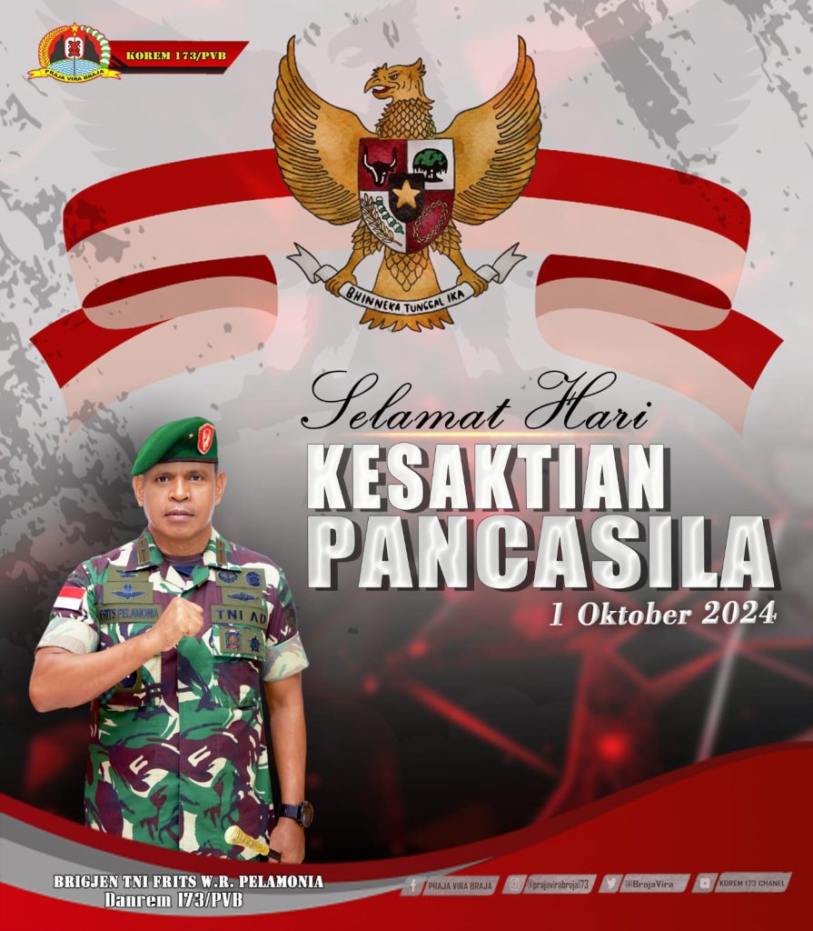 BerandaUncategorizedSELAMAT HARI KESAKTIAN PANCASILA, 1 OKTOBER 2024 Uncategorized SELAMAT HARI KESAKTIAN PANCASILA, 1 OKTOBER 2024 By admin Oktober 1, 2024 0 3547 Bagikan FacebookTwitterWhatsApp Bagikan FacebookTwitterWhatsApp Artikel SebelumnyaPeringati HUT TNI ke-79, Korem 173/PVB Gelar Kegiatan Donor Darah, Pengobatan Umum dan Pembagian Sembako serta makan gratisArtikel SelanjutnyaDanrem 173/PVB Brigjen TNI Frits W.R. Pelamonia Pimpin Apel kesiapan dalam Rangka Gladi Kotor Peringatan HUT TNI ke-79 adminhttps://korem173.tni-ad.mil.id RELATED ARTICLES korem 173 Tongkat Komando Korem 173/PVB Resmi Beralih, Mayjen TNI Frits W.R. Pelamonia Serahkan Jabatan kepada Brigjen TNI I Ketut Mertha Gunarda Desember 15, 2025 Uncategorized Panglima TNI Terima 650 Unit Ransus Maung dari Kemhan untuk Perkuat Pertahanan NKRI Maret 2, 2025 Uncategorized KEPALA STAF KOREM 173/PVB, PIMPIN UPACARA PENERIMAAN SATGAS PAMTAS KEWILAYAHAN YONIF 112/DJ Januari 21, 2025 TINGGALKAN KOMENTAR Batal membalas Komentar: Silakan masukkan komentar anda! Nama:* Silakan masukkan nama Anda di sini Email:* Anda telah memasukkan alamat email yang salah! Silakan masukkan alamat email Anda di sini Website: Simpan nama, email, dan situs web saya di browser ini untuk lain kali saya berkomentar. Δ Berita Populer Pimpin Upacara 17-an di Makorem 173/PVB, Brigjen TNI I Ketut Mertha Gunarda Tekankan Disiplin, Akuntabilitas Program Kerja dan Peran Prajurit Bangun Papua Maret 17, 2026 Kolonel Inf Budy Suradi Hadiri Rapat Kesiapan Pengamanan Idul Fitri 1447 H di Nabire, Perkuat Sinergi Lintas Sektoral Maret 12, 2026 Kasi Intel Kasrem 173/PVB Kolonel Inf Budy Suradi Hadiri Rapat Pimpinan Polda Papua Tengah 2026, Perkuat Sinergitas TNI–Polri Demi Stabilitas Keamanan dan Dukungan Program... Maret 12, 2026 DIRGAHAYU KOSTRAD KE 65 TAHUN Maret 6, 2026 Muat lebih banyak Komentar Terbaru budi pada KOMITMEN JAGA NETRALITAS TNI, DANREM 173/PVB SOSIALISASIKAN NETRALITAS TNI DI WILAYAH KAB. SUPIORI.