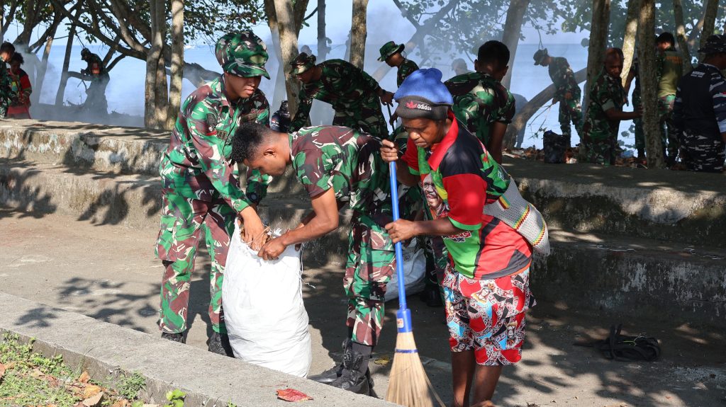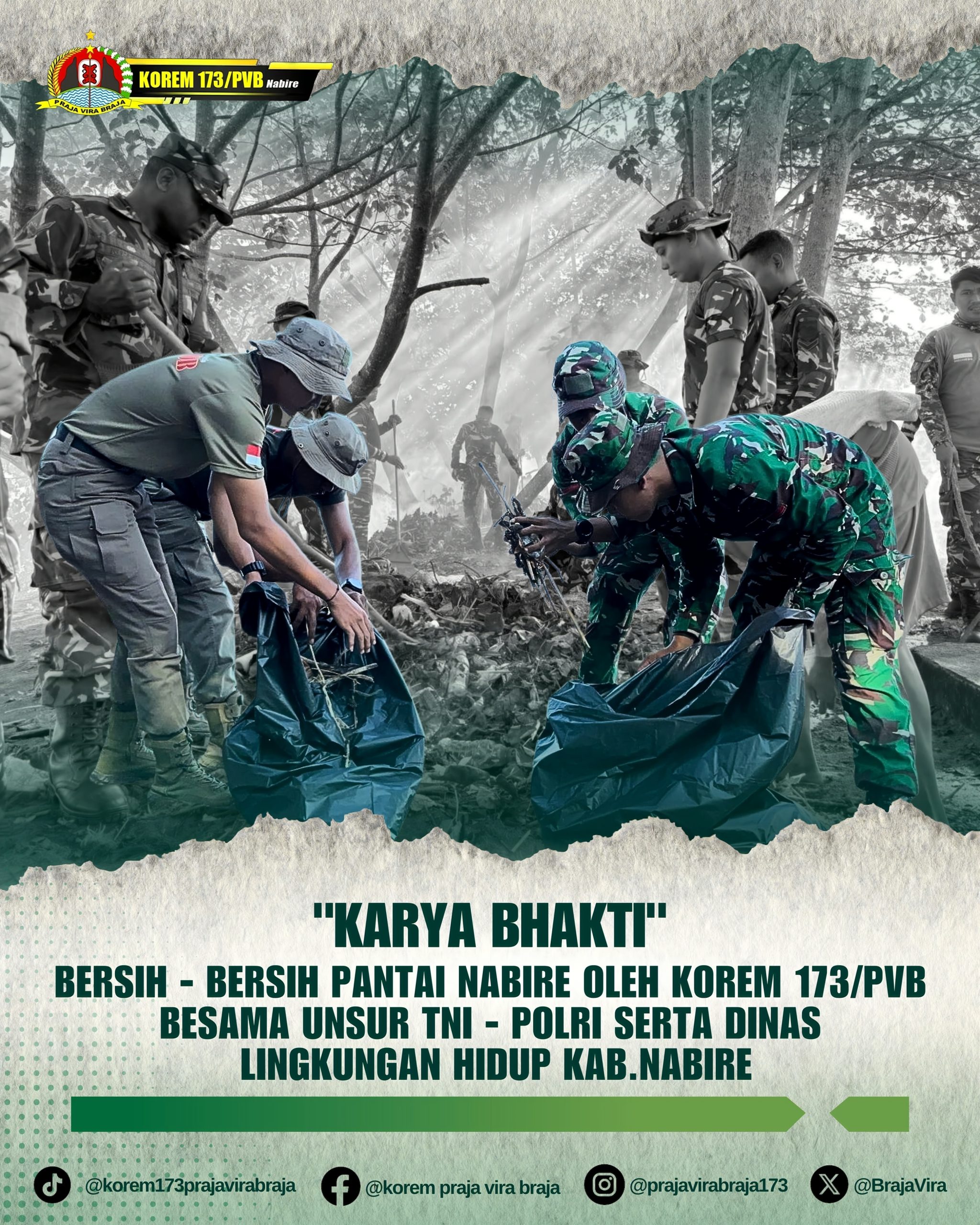 Nabire,papua tengah – Wujud nyata kepedulian terhadap kelestarian lingkungan dan kebersihan wilayah pesisir, Prajurit Korem 173/Praja Vira Braja (PVB) bersama unsur TNI-Polri serta Dinas Lingkungan Hidup Kabupaten Nabire melaksanakan kegiatan pembersihan di sepanjang pesisir Pantai Nabire, Provinsi Papua Tengah, pada Rabu 4 februari 2026.